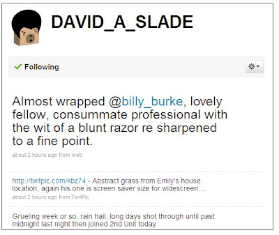 Denna gången Twittrar han om Billy Burke (Charlie Swan) och om det abstrakta gräset på Emilys tomt.