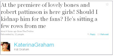 Jo enligt Vampire Diaries's skådespelerskan Katerina Graham var Robert Pattinson igår på premiären av "The Lovely Bones" på LA Grauman's Chinese Theater i Hollywood.